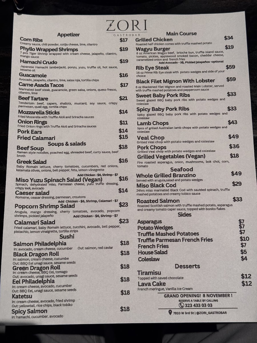 Welcome to ZORI GASTROBAR, located in the heart of Los Angeles at 7910 W 3rd St. This culinary haven invites diners into a seductive, atmospheric environment where luxurious decor meets bold flavors. The menu is a vibrant tapestry of carefully crafted dishes that combine freshness and artistry.